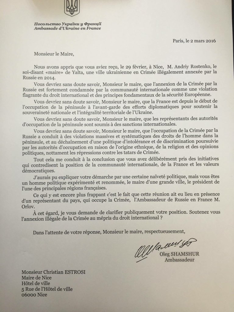 Et le problème n'est pas dans l'incapacité de Monsieur Chamchour à écrire en français. Ni même qu'il ne se trouve à l'Ambassade un seul collaborateur capable de le faire. Le problème est que toutes les institutions oukraïniennes de France ont été réduites à l'état végétatif et qu'il n'y a personne pour dire à son Excellence qu'écrire en petit-nègre est IMPOSSIBLE pour le représentant officiel du pays.